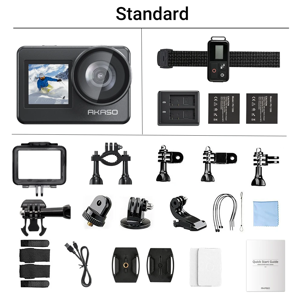 1x AKASO Brave 7 Action Camera/ 1x Remote Control/ 2x 1350mAh Battery/ 1x Camera Frame/ 1x Battery Charger/ 1x Bicycle Stand/ 6x Mount/ 2x 2-sided tape/ 2x Helmet Mount/ 1x Bandages/ 5x Tethers/ 1 x Protective Backdoor/ 1x USB Cable/ 1x Lens Cloth/ 1x Quick Reference Guide