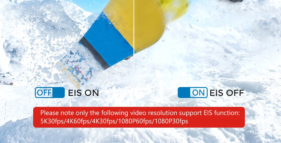 EIS supports to use with these Video Resolution: 5K30fps/4K60fps/4K30fps/1080P60fps/1080P30fps